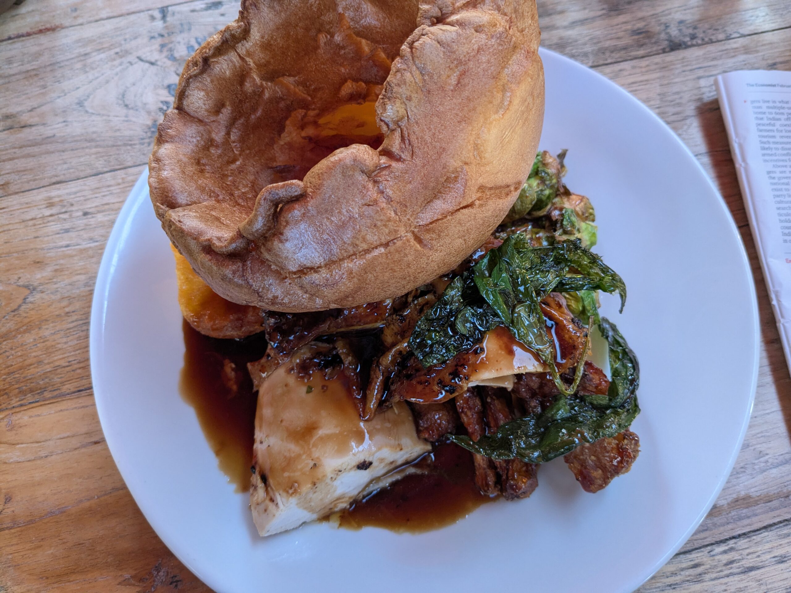 Not so finally would have been a Yorkshire pudding, but I had the uninspiring stuffing instead. My beef-eating accomplice advised that the Yorkshire was dry, old and pointless. She offered me some but I couldn’t be bothered to try to cut it. She was complimentary about the beef – though apparently it had too much mustard coating.