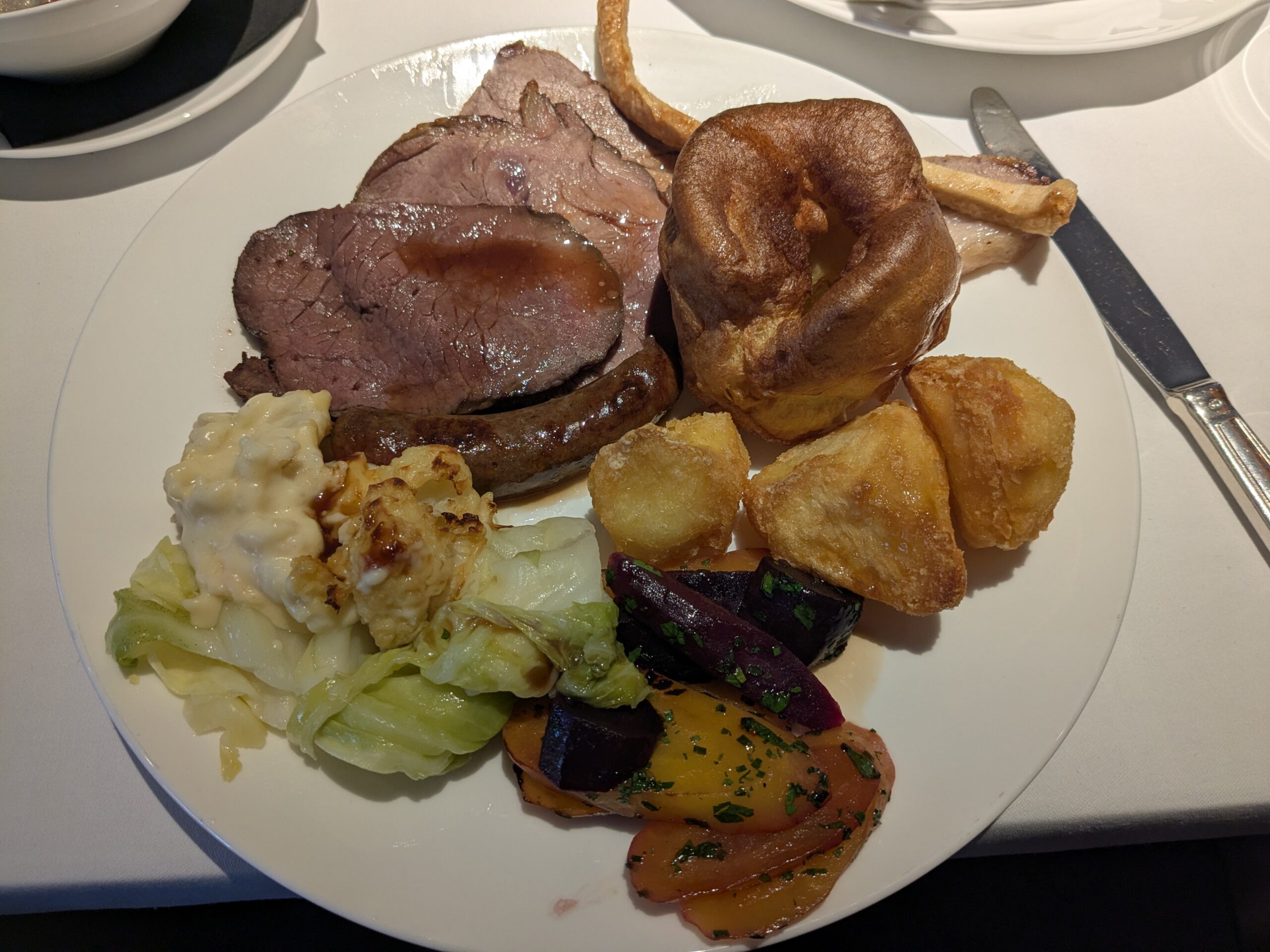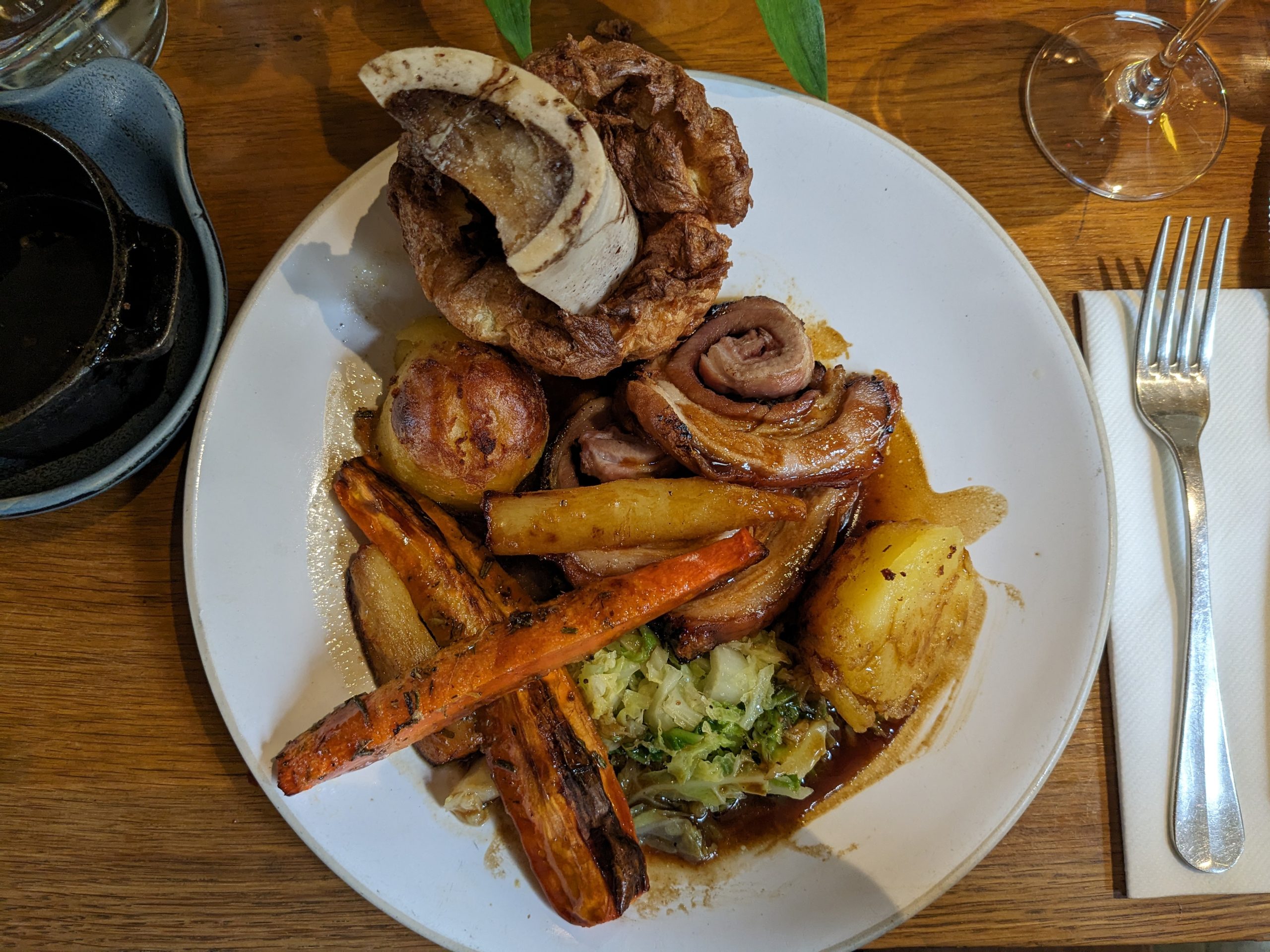 And when I sat down, I then read the menu properly and discovered that they had a ‘toad in the hole’ roast dinner with Cumberland sausages. For just £12.
