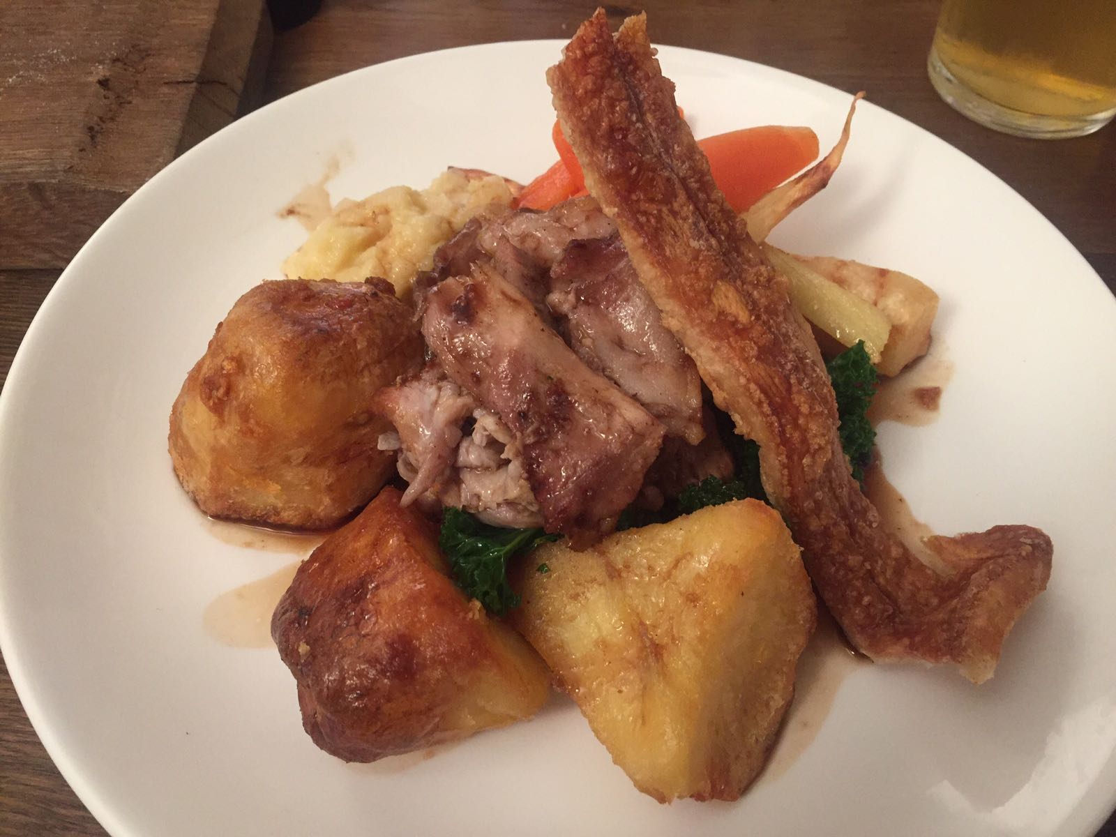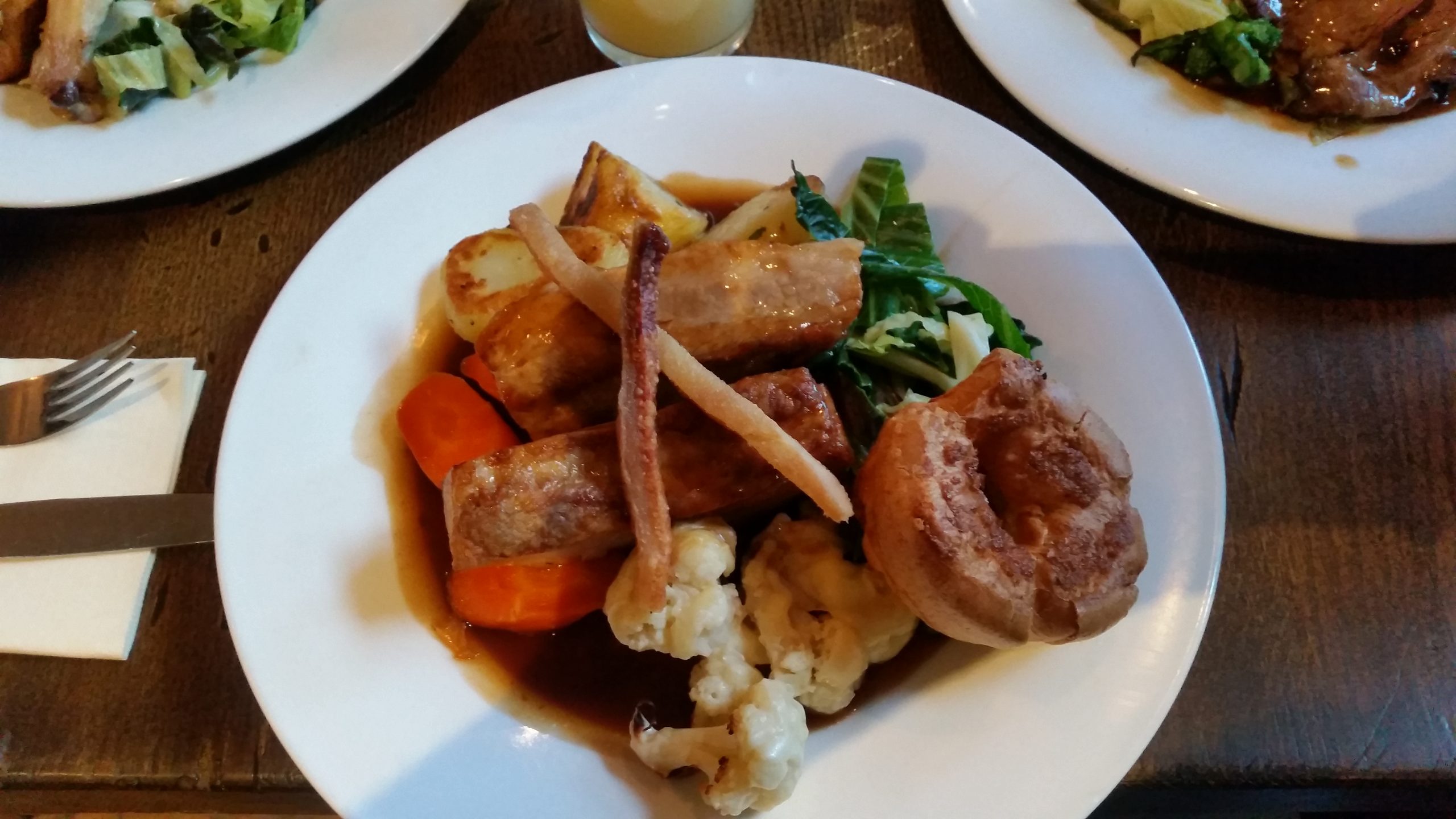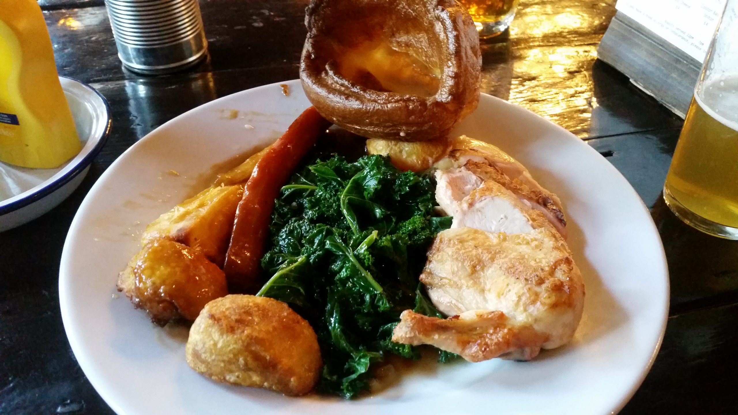 On the menu was roast pork, roast beef and roast half chicken. I’d kind of like to know what cut I was to be feeling the texture of, so I just went for the chicken as a safe choice, at the price of £16. The vegetarian actually sounded interesting, vegetarian haggis & root vegetable Wellington – until I realised the word, “vegetarian”.
